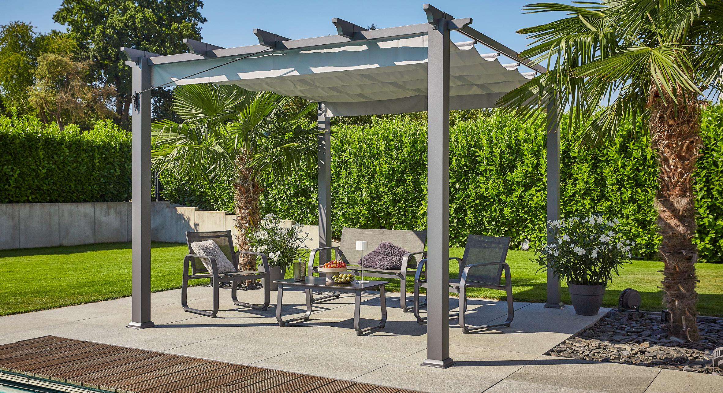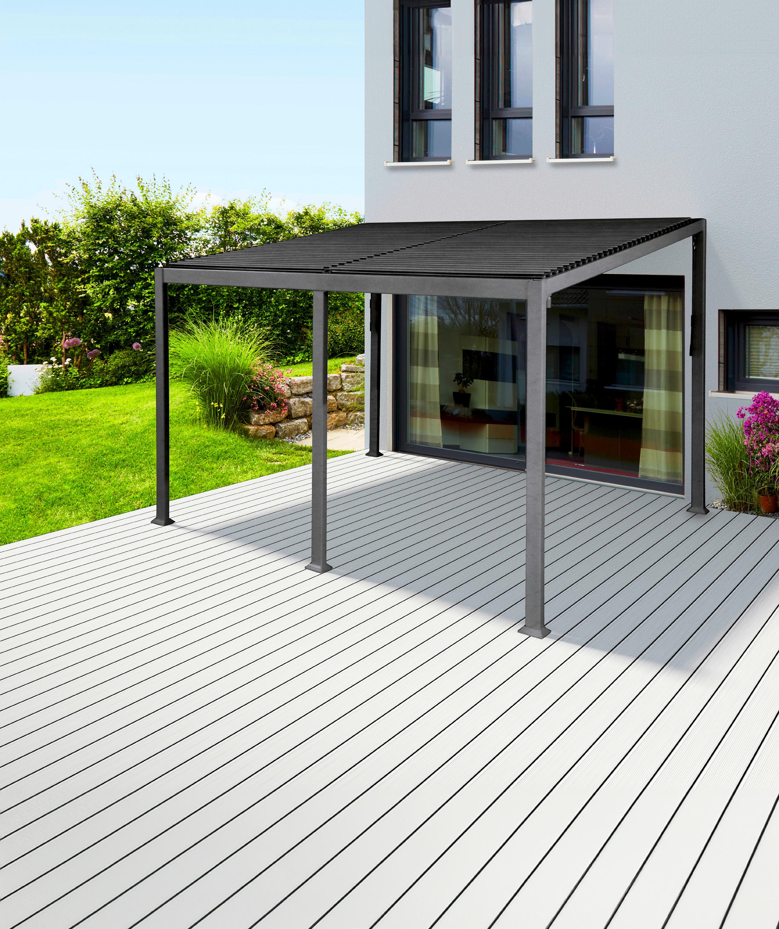 d 300 x š 300 x v 215 / 255 cm, aluminijasto ogrodje, lamelna aluminijasta streha, enostavno odpiranje in zapiranje s pomočjo ročice, s sistemom za odvajanje vode, brez žleba, antracit 27006937