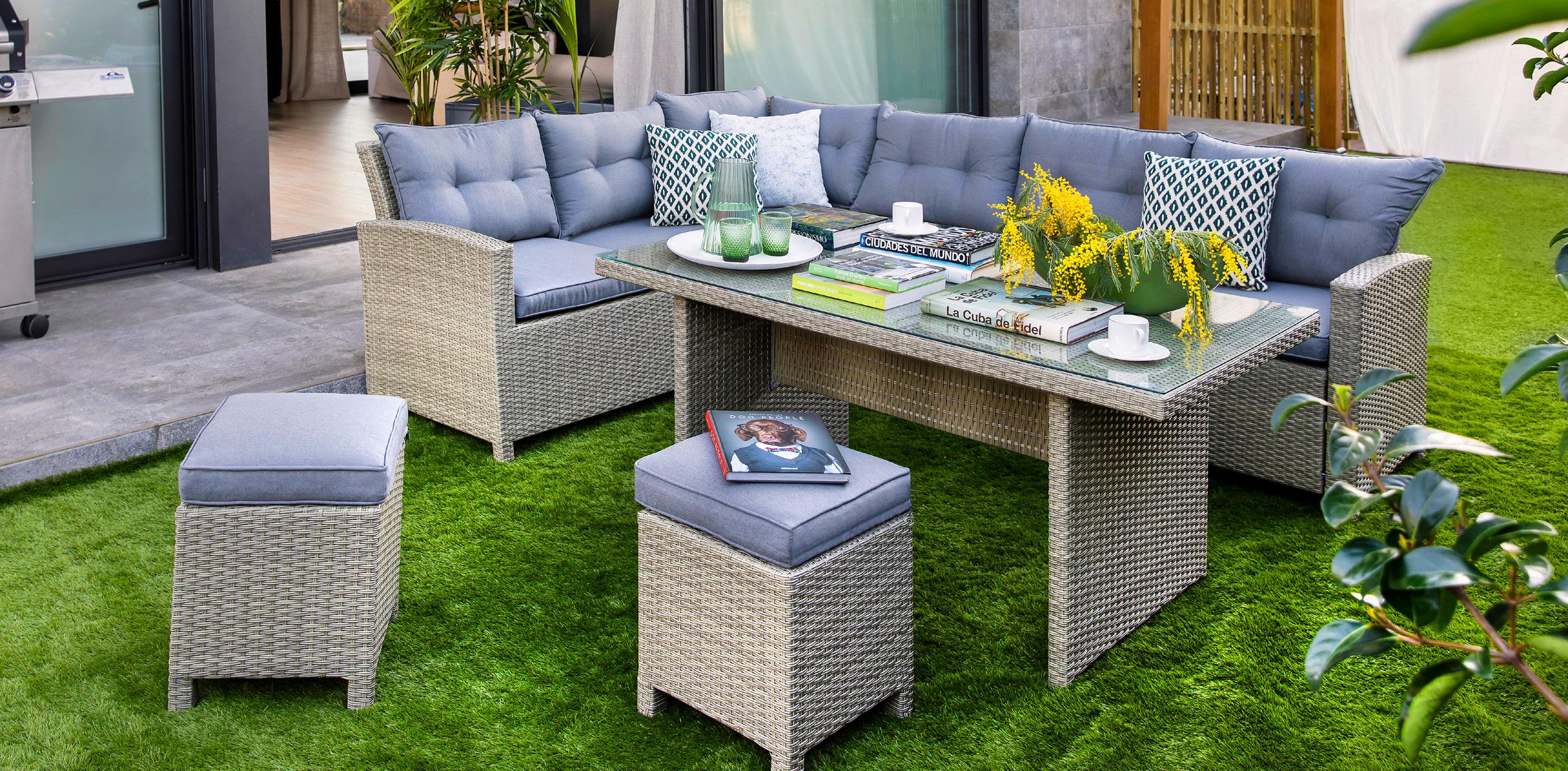 sestavljena iz troseda z naslonjali za roke d 178 x š 78 x v 84 cm, ravnega troseda d 206 x š 78 x v 84 cm, dveh taburejev d 41,5 x š 41,5 x v 37 cm in mize d 151 x š 78 x v 84 cm s stekleno ploščo deb. 5 mm, aluminijasto ogrodje / pletivo iz umetnega ratana, vklj. blazine za sedeže in naslone, antracit / siva 26351625 790,-