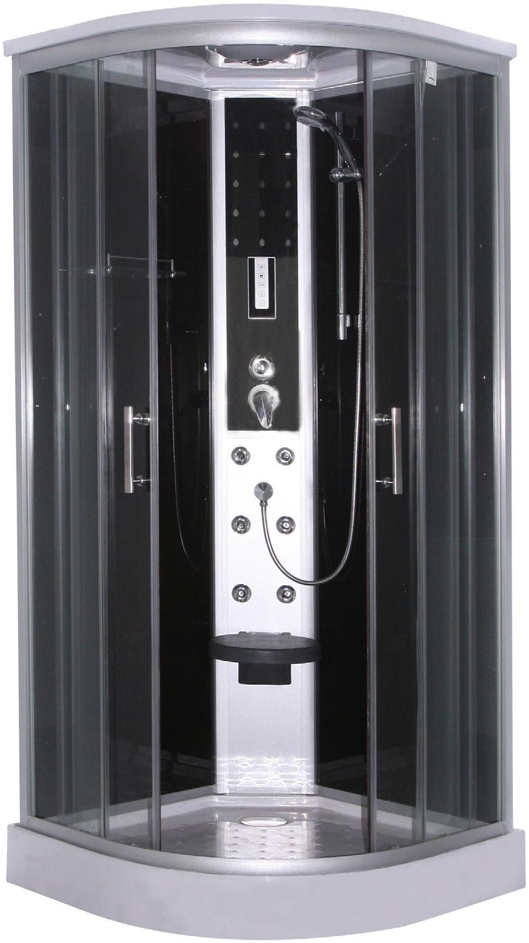 vratavarnostno steklo deb. 5 mm, zadnja stena - varnostno črno kaljeno steklo deb. 4 mm, aluminijasti krom profili, nadglavna prha, tuš ročka, enoročna armatura, 6 masažnih šob, steklena polica, radio, osvetlitev, zložljiv sedež, tuš kad, po naročilu 21757884