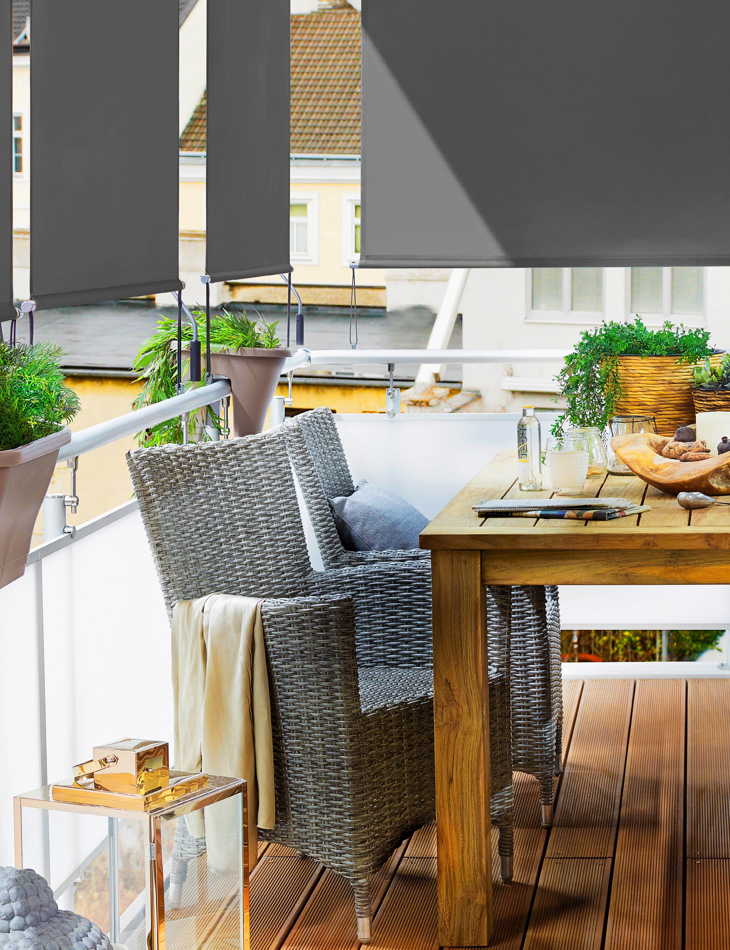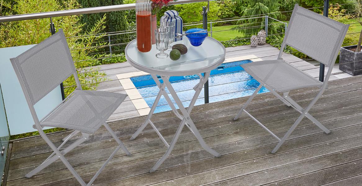 Balkonski komplet 'Miren' sestavljen iz dveh stolov d 51 x š 46 x v 82 cm in mize Ø 60 x v 71 cm s stekleno ploščo deb. 5 cm, jekleno ogrodje / steklo / tekstil, zložljiv, siv 109,- 26386520
