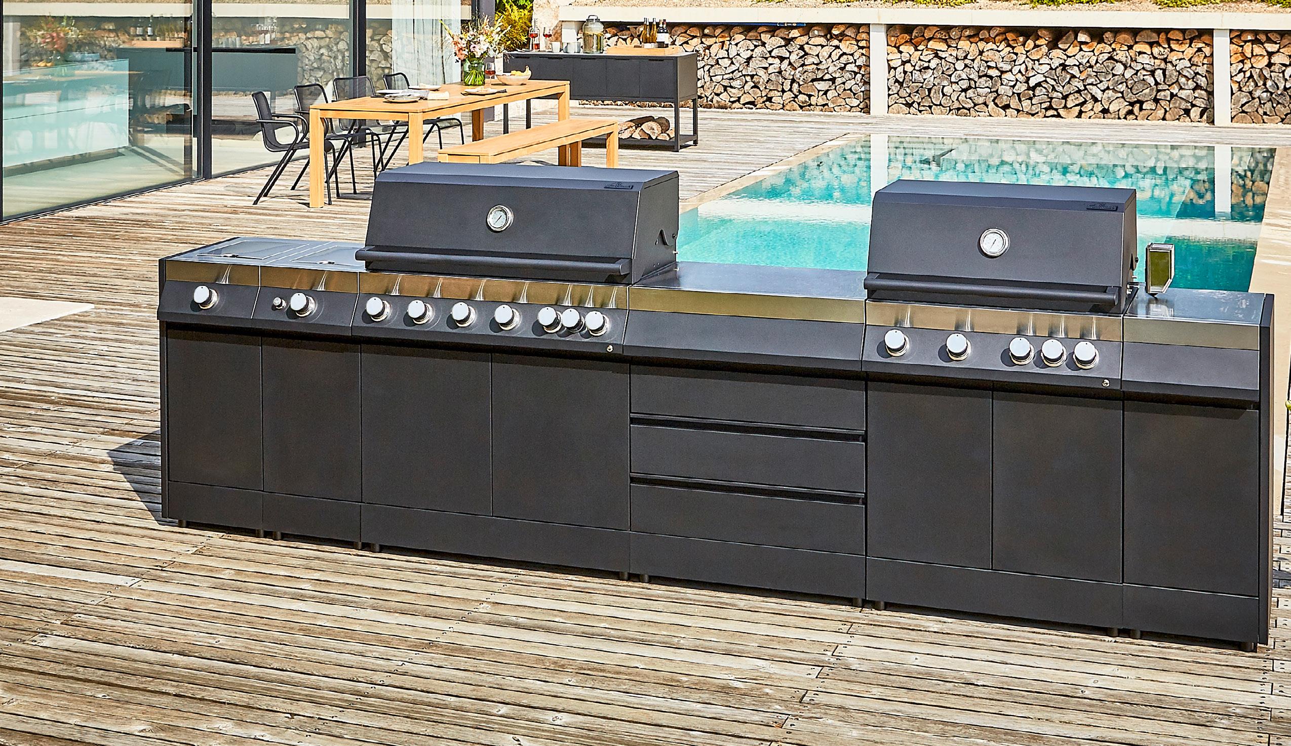 Letna kuhinja 'Too much BBQ3' visokokakovostno nerjavno jeklo, plinski žar 22,86 kW, 6 gorilnikov in stranski gorilnik, površina za peko 66 x 45,5 cm, kontrolno okence, regulator, pomivalno korito 56,5 x 57,5 x 90,5 cm (z armaturo 137,1 cm), hladilnik 56,5 x 57,5 x 90,5 cm, črn marmorni pult 28540757
