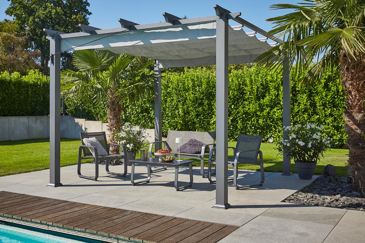 d 300 x š 600 x v 215 / 255 cm, aluminijasto ogrodje, lamelna aluminijasta streha, odpiranje in zapiranje s pomočjo ročice, s sistemom za odvajanje vode, brez žleba, antracit 26129637