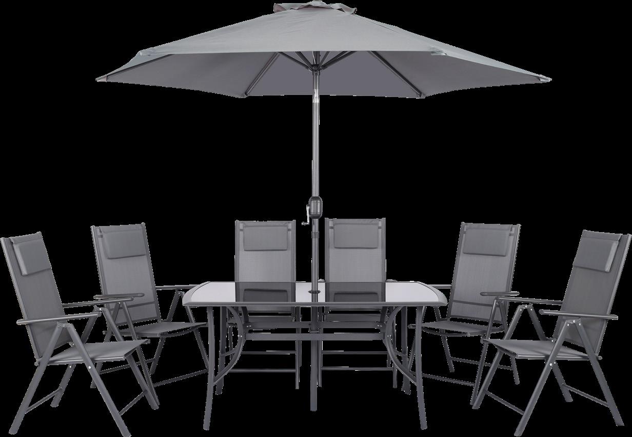sestavljena iz mize s stekleno ploščo d 150 x š 90 x v 71 cm, 6 zložljivih stolov d 55 x š 72 x v 107 cm in senčnika Ø 270 cm, jekleno ogrodje / poliester, antracit 28152392