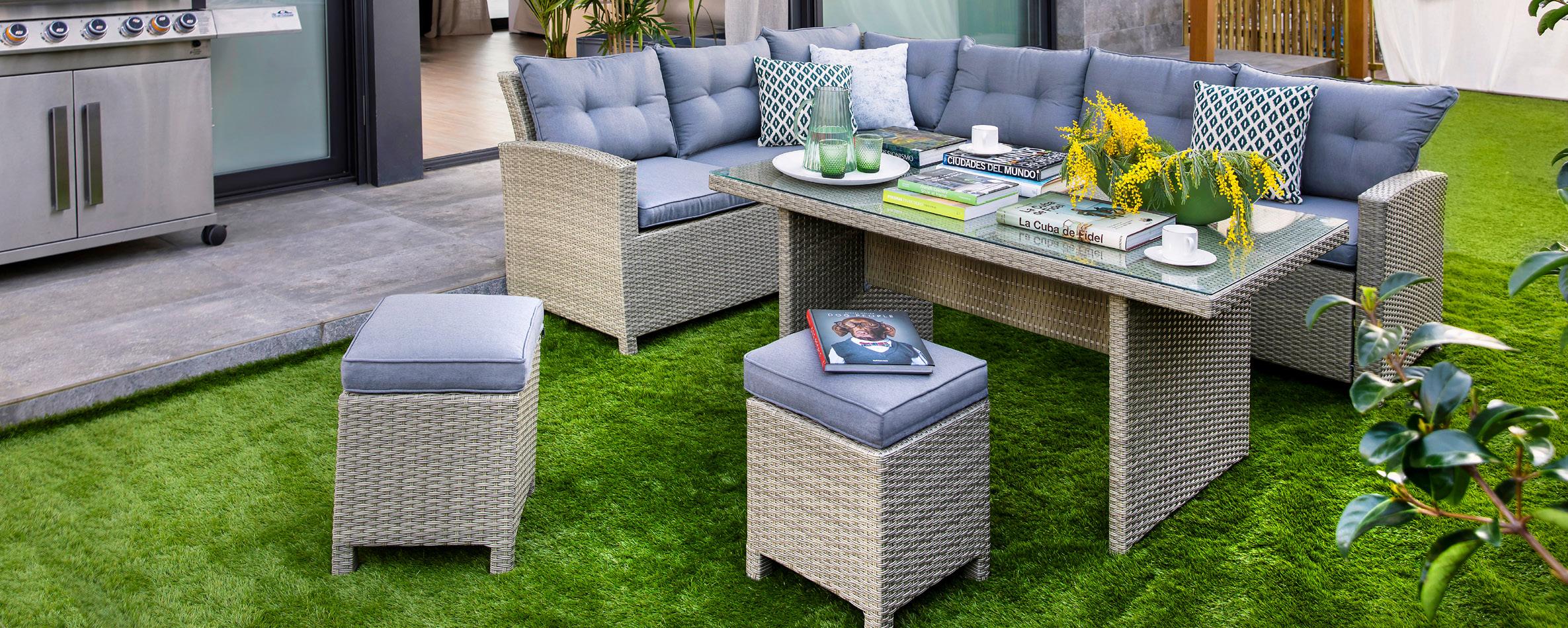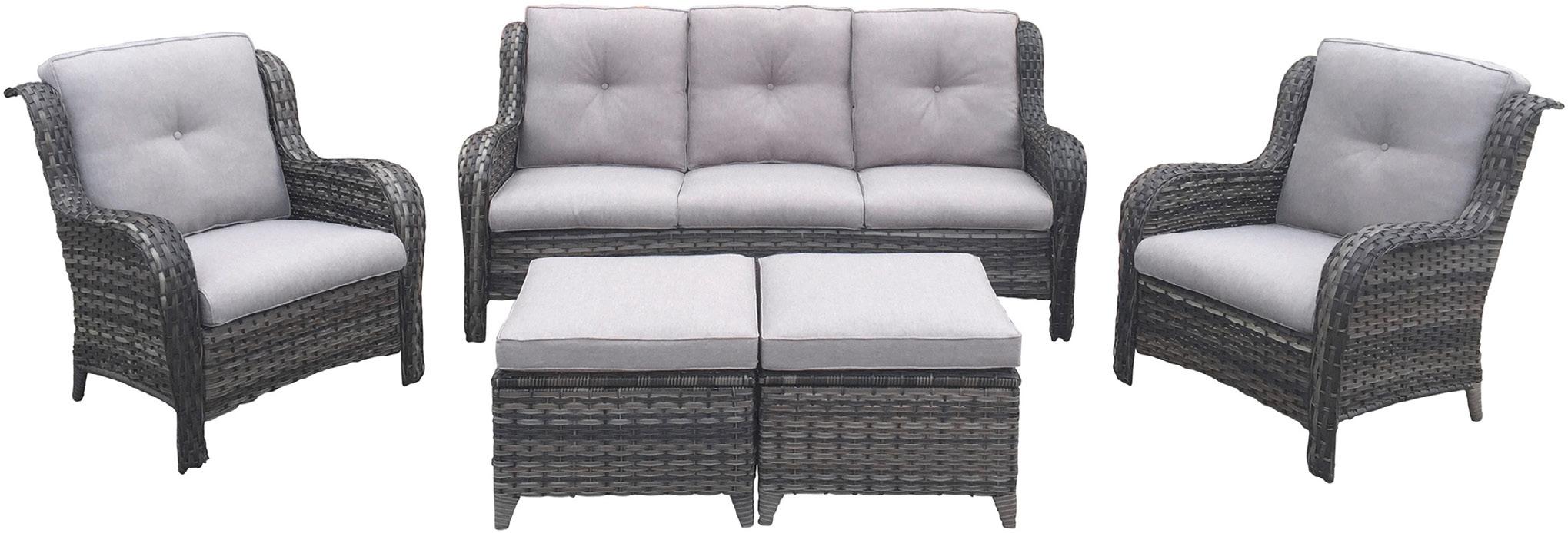 sestavljena iz troseda z naslonjali za roke d 178 x š 78 x v 84 cm, ravnega troseda d 206 x š 78 x v 84 cm, dveh taburejev d 41,5 x š 41,5 x v 37 cm in mize d 151 x š 78 x v 84 cm s stekleno ploščo deb. 5 cm, aluminijasto ogrodje / pletivo iz umetnega ratana, vklj. blazine za sedeže in naslone, antracit / siva 26351625
