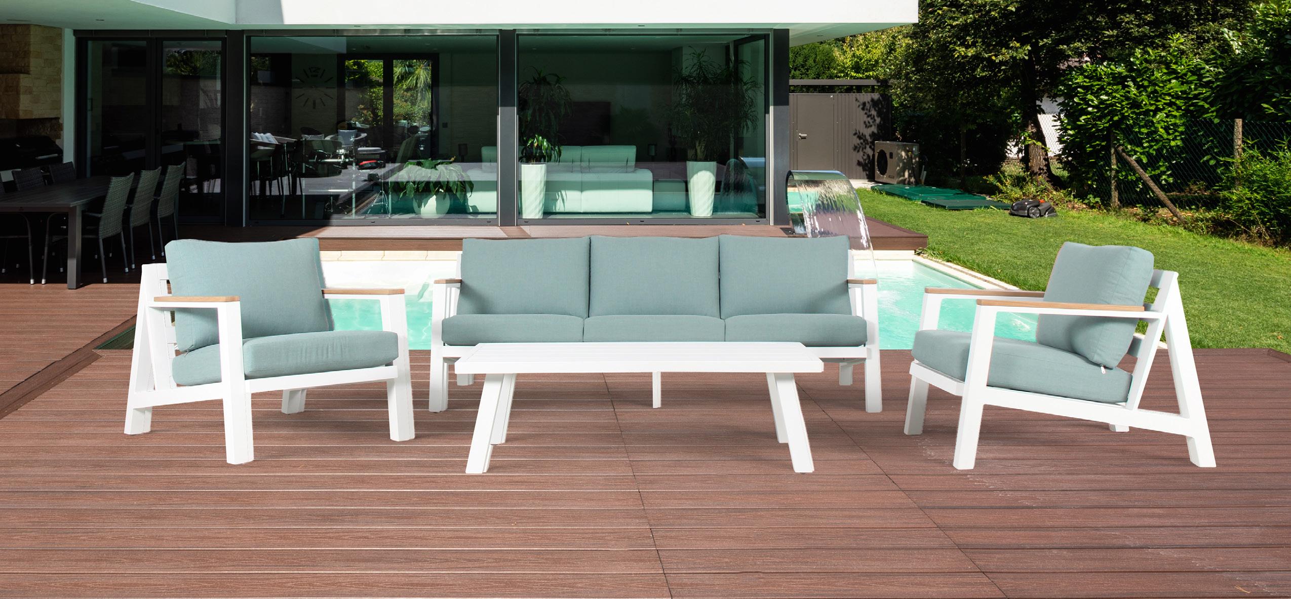 sestavljena iz troseda d 207 x š 94 x v 71 cm, dveh naslanjačev d 77 x š 94 x v 71 cm in mize d 130 x š 66,2 x v 40 cm, prašno barvano aluminijasto ogrodje / mizna plošča iz aluminijastih letvic, aluminijast naslon za roke, ki prenaša toploto, vklj. blazine za sedeže in naslone deb. 10 cm, bela / zelena 949,- 31449995