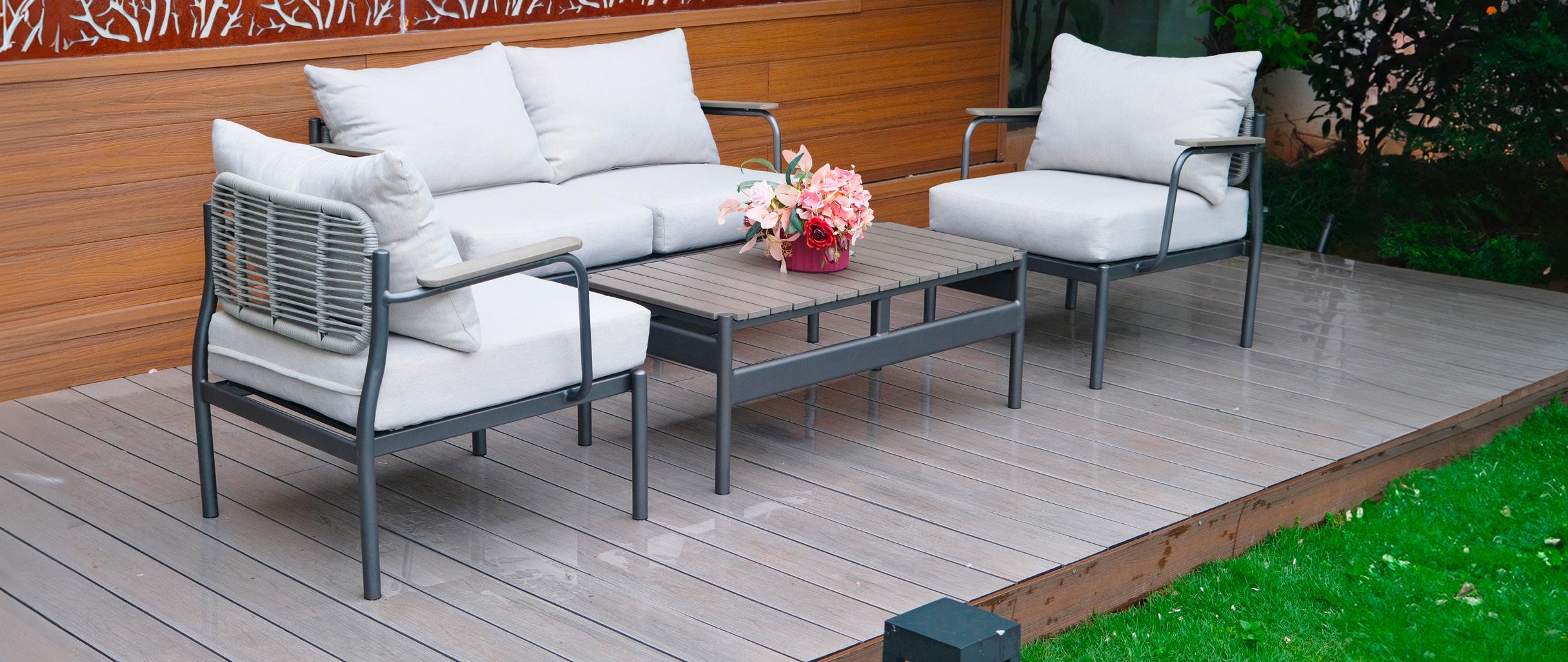 sestavljena iz troseda d 212,5 x š 85 x v 76,5 cm, dveh naslanjačev d 76,5 x š 85 x v 76,5 cm in mize d 135 x š 67 x v 36 cm, prašno barvano aluminijasto ogrodje, vklj. debele blazine, črna / temno siva 949,- 28693776