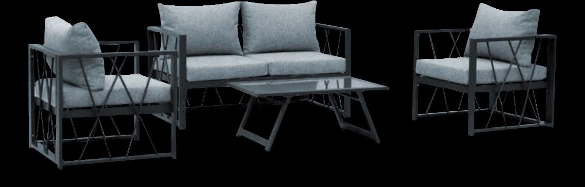 sestavljena iz dvoseda d 130 x š 70 x v 64 cm, dveh naslanjačev d 70 x š 70 x v 64 cm in mize d 90 x š 55 x v 35 cm z mizno ploščo iz varnostnega stekla, visokokakovostno aluminijasto ogrodje, vklj. blazine za sedeže in naslone, antracit / siva 699,- 29192124