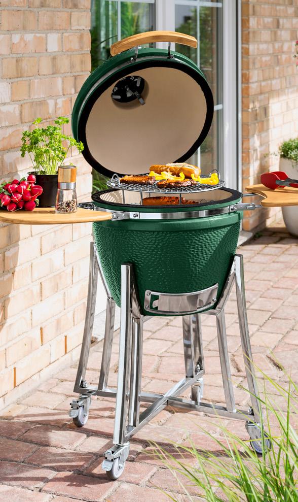 d 134 (s policami) x š 84 x v 117 cm, 2 žar rešetki iz nerjavnega jekla Ø 47 cm in Ø 49 cm, ohišje iz visokokakovostne keramike z glazuro, 2 zložljivi stranski odlagalni polici iz bambusa, s prezračevalnikom, lovilni sistem za pepel, s koleščki, primeren za direktno in indirektno peko, dimljenje ali kuhanje, zelen, do odprodaje zalog 669,24790134