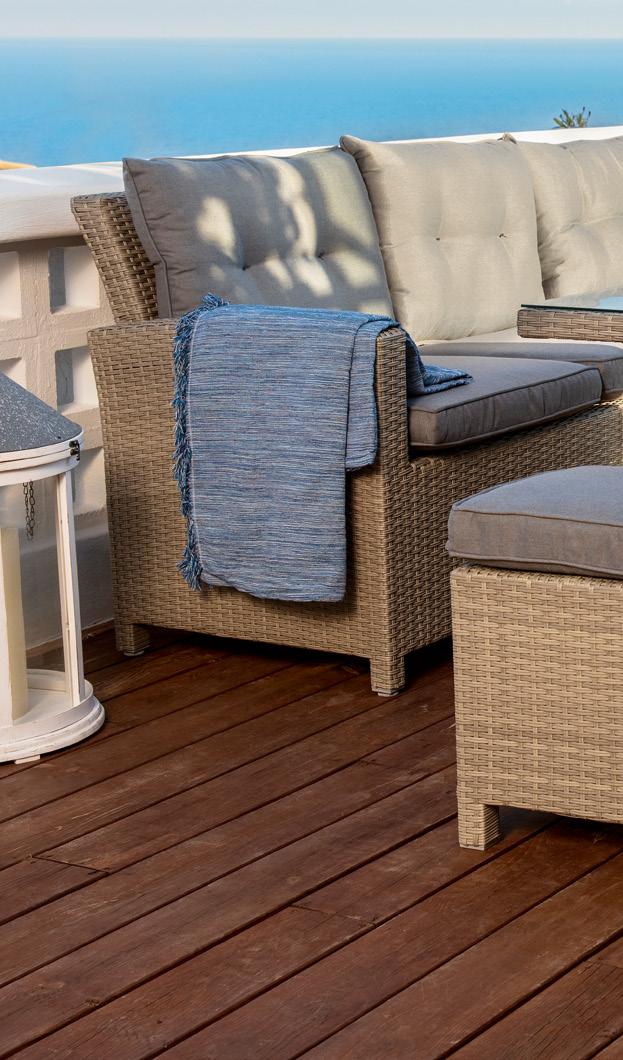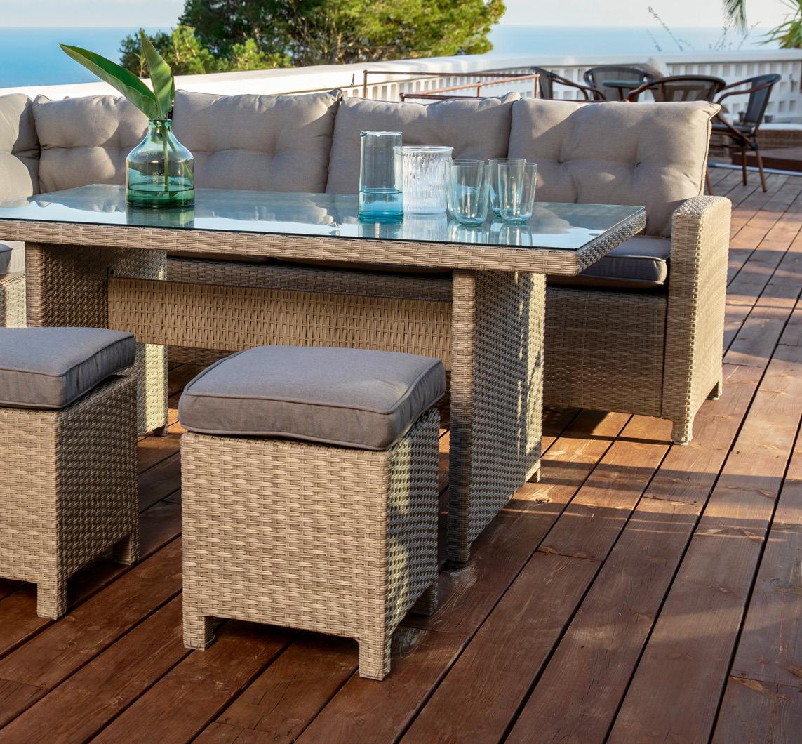 sestavljena iz troseda d 178 x š 78 x v 84 cm, ravnega troseda d 206 x š 78 x v 84 cm, 2 taburejev d 41,5 x š 41,5 x v 37 cm, ter mizice s stekleno ploščo deb. 5 mm d 151 x š 78 x v 84 cm, aluminijasto ogrodje / pletivo iz umetnega ratana, vklj. z blazinami za sedež in naslon v antracitni barvi 26351625 939,-