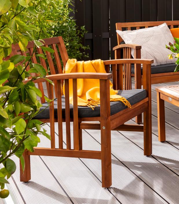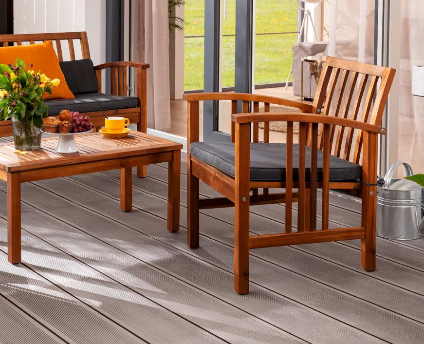 sestavljena iz dvoseda d 120 x š 62,5 x v 75,7 cm, dveh stolov d 60 x š 62,5 x v 75,7 cm in mize d 80 x š 45 x v 37,4 cm, les akacije, vklj. z blazinami iz poliestra v sivi barvi
