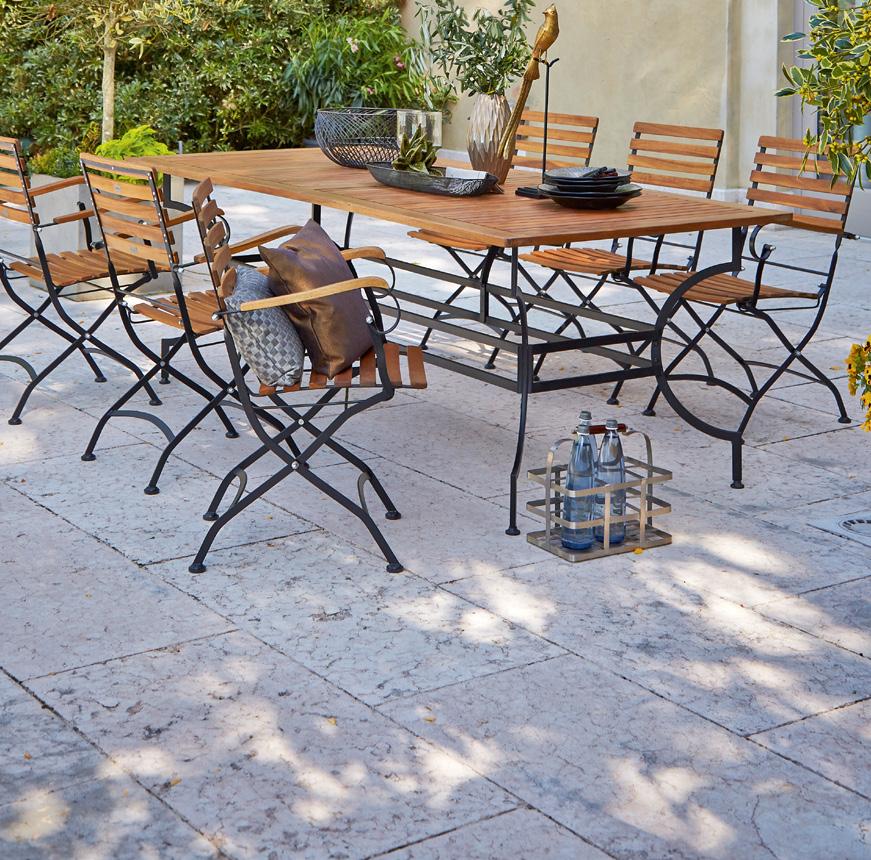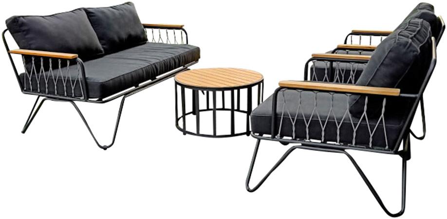 sestavljena iz dvoseda d 131 x š 70 x v 71 cm, dveh naslanjačev d 70 x š 70 x v 71 cm in mizice d 60 x š 45 cm, prašno barvano jekleno ogrodje / naslonjala za roke iz tikovega lesa, vklj. z vodoodbojnimi blazinami za sedež in naslon v antracitni barvi 28794402 699,-