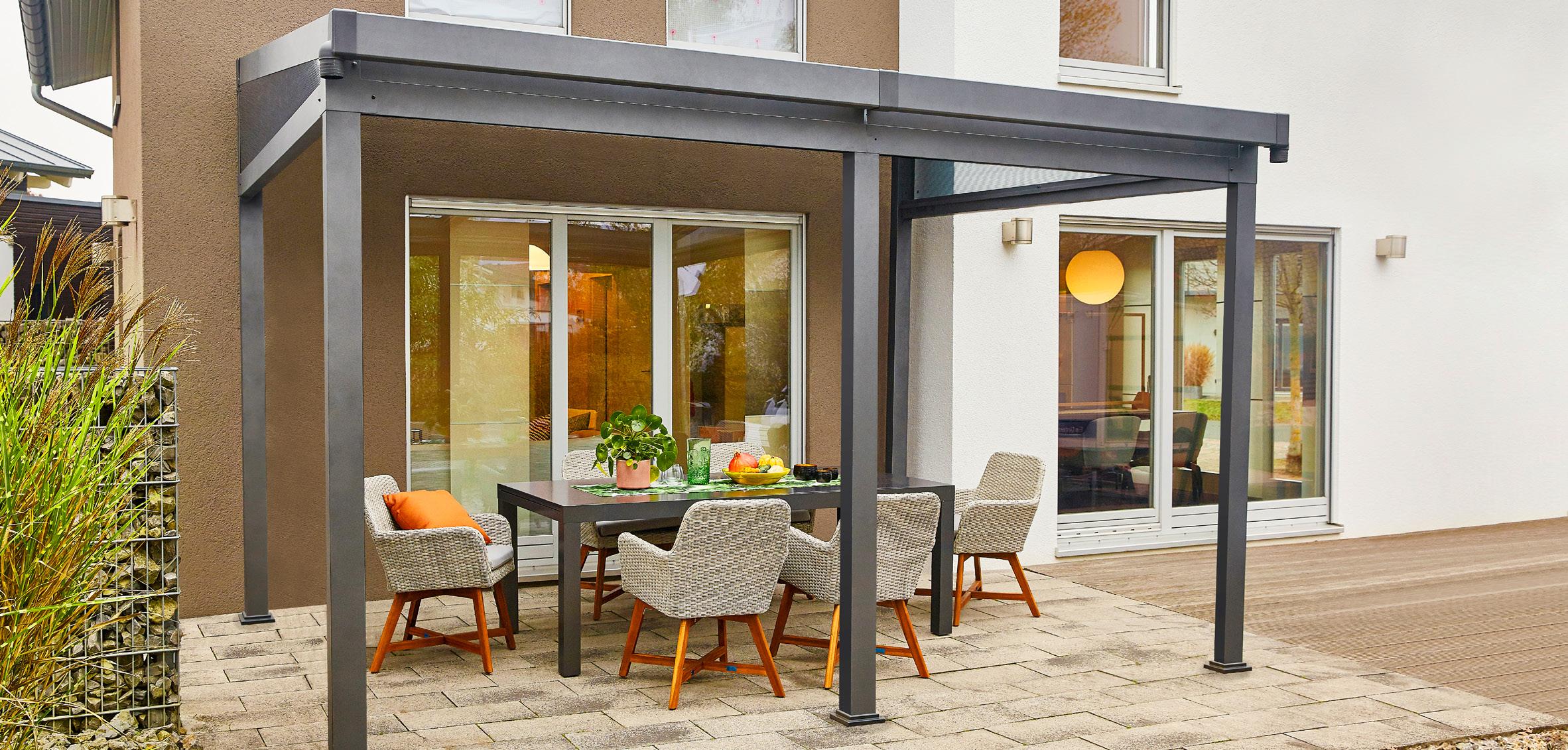 prašno barvano aluminijasto ogrodje, polikarbonatna streha, ⅔ strehe se lahko odkrije, vklj. priključek za žleb, antracitne barve