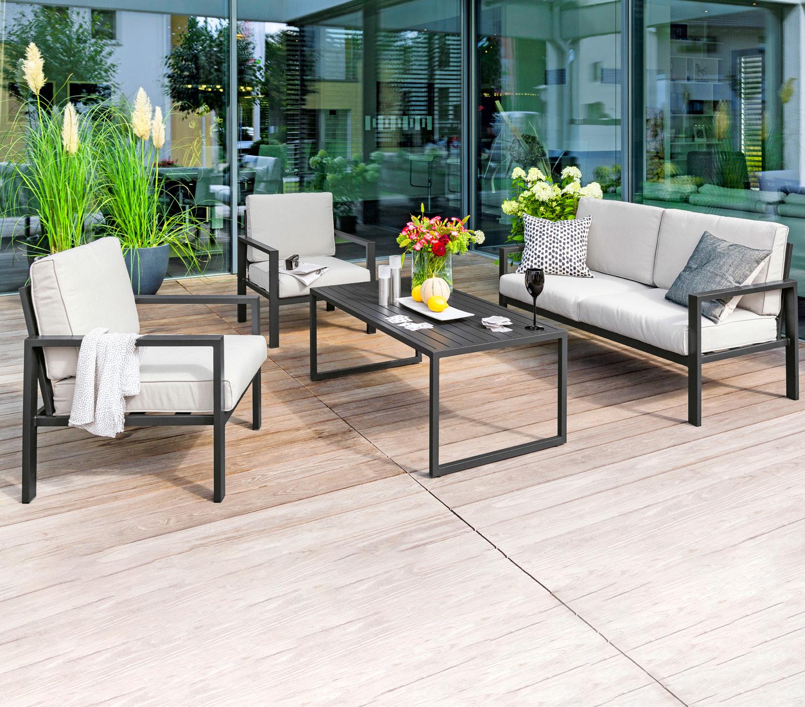 sestavljena iz dvoseda d 141 x š 69 x v 70 cm, dveh naslanjačev d 65 x š 69 x v 70 cm in mize d 120 x š 62 x v 45 cm, aluminijasto ogrodje antracitne barve, vklj. z blazinami iz poliestra v svetlo sivi barvi 24908627 689,-