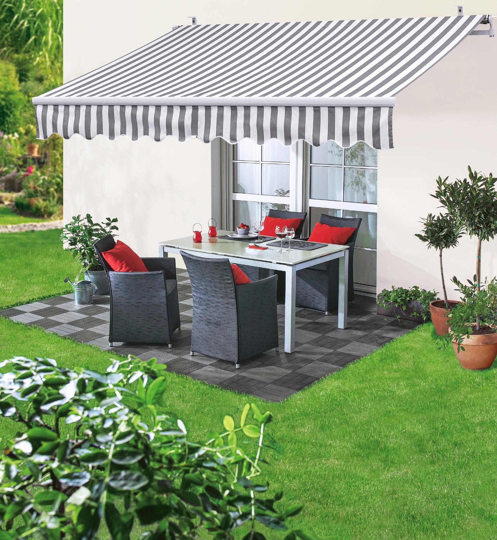 sestavljena iz mize s stekleno ploščo d 150 x š 90 x v 71 cm, 6 zložljivih stolov d 55 x š 72 x v 107 cm in senčnika Ø 270 cm, jekleno ogrodje / poliester, antracit 28152392
