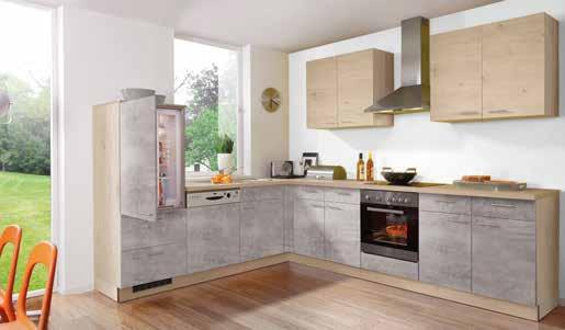 KOMPLETNA KUHINJA, barva: videz betona/svetlo siva, 245x306 cm, vklj. z vsemi navedenimi Leonard inoks električnimi aparati: vgradna pečica energijski razred A, steklokeramična kuhalna plošča, hladilnik energijski razred F, napa, na voljo v različnih postavitvah in barvnih kombinacijah. Pomivalni stroj in pomivalno korito za doplačilo, 185340/1