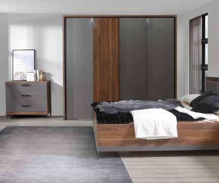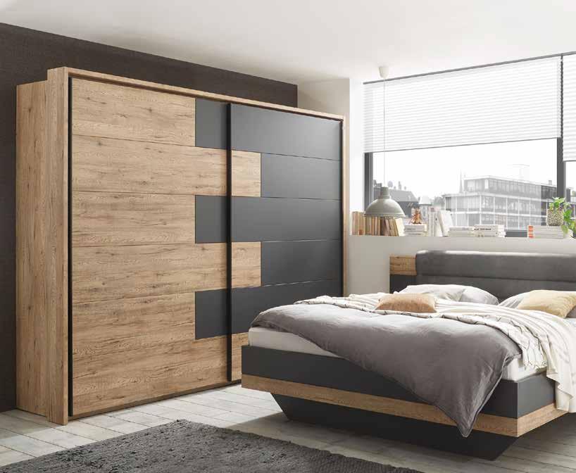 OMARA Z DRSNIMI VRATI, barva: hrast/ grafit, 2-vratna, z policami in drogom za obešanje oblačil, ŠxVxG: 270x210x60 cm, brez paspartuja, 194793/1 POSTELJA, barva: hrast/ grafit, ležalna površina: 180x200 cm, vklj. 2 nočni omarici in oblazinjeno vzglavje, ŠxVxG: 297x46-99x212 cm, 194793/2