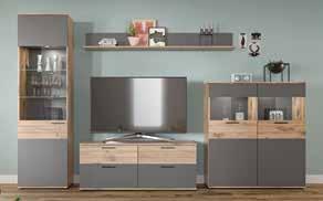 DNEVNI REGAL, barva: Basalt siva/Nox hrast imitacija, ŠxVxG: 327x200x44 cm sestavljena iz: vitrine, ŠxVxG: 57x200x37 cm, TV element, Š/V/G: 130x53x44 cm, stenske police, ŠxVxG: 180x21x20 cm in vitrine, ŠxVxG: 110x122x37 cm, 197392