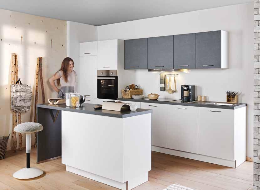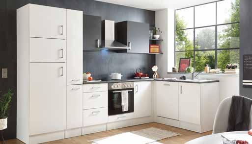 do KUHINJA, barva: motno belo lakirana/temno jeklo, 360x185 cm, vklj. z vsemi navedenimi inoks električnimi aparati, na voljo v različnih postavitvah in barvnih kombinacijah. Pomivalni stroj ter pomivalno korito za doplačilo, 194306/1 OBROČNO ODPLAČEVANJE