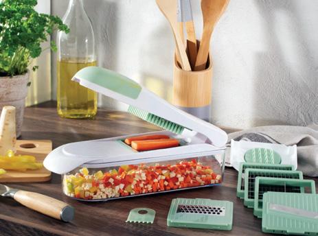 s 6 nastavki za rezanje, nedrsečimi nogami in posodico za živila; primeren za pomivanje v pomivalnem stroju (razen čistilnega glavnička ter nastavkov)