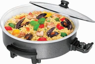 • moč 1500 W • premer 42 cm, globina 9 cm • keramični premaz površine • hitro segrevanje • steklen pokrov • toplotno izolirana ročaja