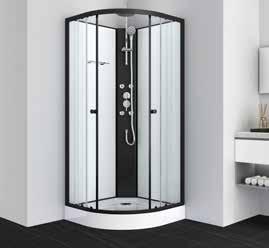 Kabina tuš PS16B RELOAD drsna vrata, 4 mm steklo, črni aluminijasti profili, belo ozadje, naglavna prha širine 20 cm, 4 masažne šobe, 90 x 90 x 225 cm
