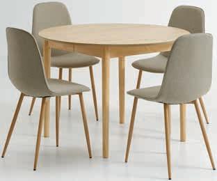 Miza: Masiven les in hrastov furnir. Ø110xV75 cm. Z 2 miznima kriloma. Velikost razširjene mize Š110xD200xV75 cm. Stol: Tkanina in jeklo. Miza* 499.- Stol 59,99 40.-