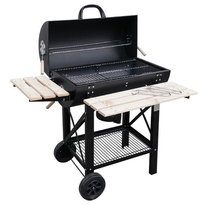 Mere: 114/68/98 cm, velikost rešetke 70/35 cm, s posodo v ovalni obliki, pokrov s termometrom, kromirana glavna rešetka za oglje in grelnik, pepelnik, spodnja polica/rešetka za dodatke, udobni ročaji in kolesa za enostavno prenašanje.