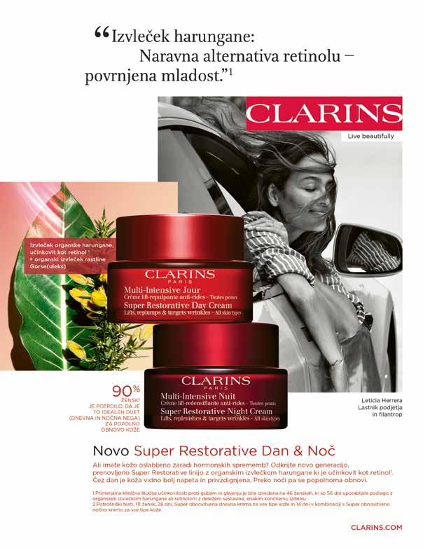 Clarins Super Restorative Day & Night Cream: dnevna krema za obraz zmanjšuje škodljive učinke zaradi hormonskih sprememb na koži, povezanih s starostjo. Iz dneva v dan je koža bolj sijoča, zglajena, enakomerna, privzdignjena in pridobi na gostoti.