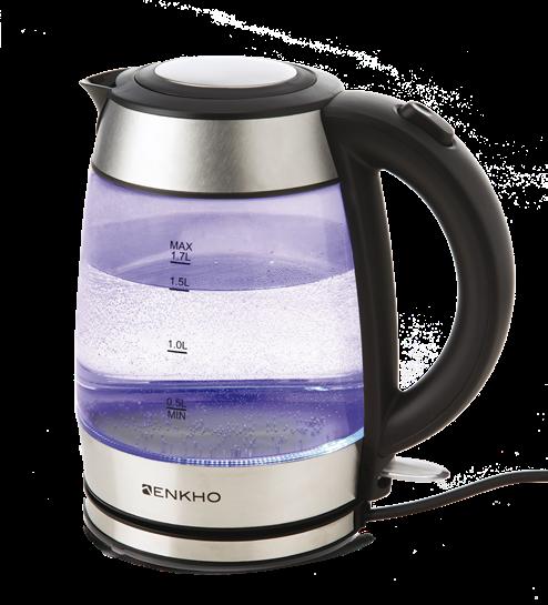 STEKLENI GRELNIK VODE 1,7 L S filtrom proti vodnemu kamnu, samodejni izklop, ko voda zavre, 360° vrtljivo podnožje z LED-lučko. Moč: 1850-2200 W.
