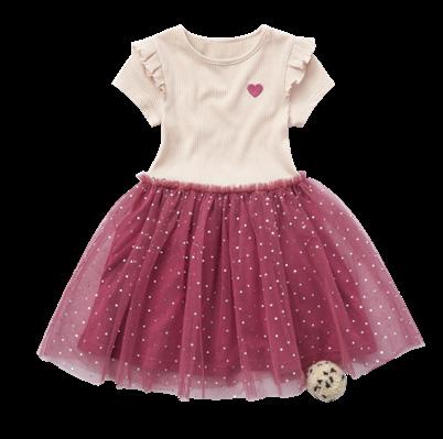 Obleka približno 100 % bombaž, z naborki na ramenih, dvoplastno krilo iz tila s potiskom zlatih srčkov, velikosti: 104–134 cm