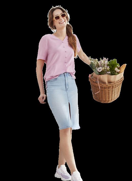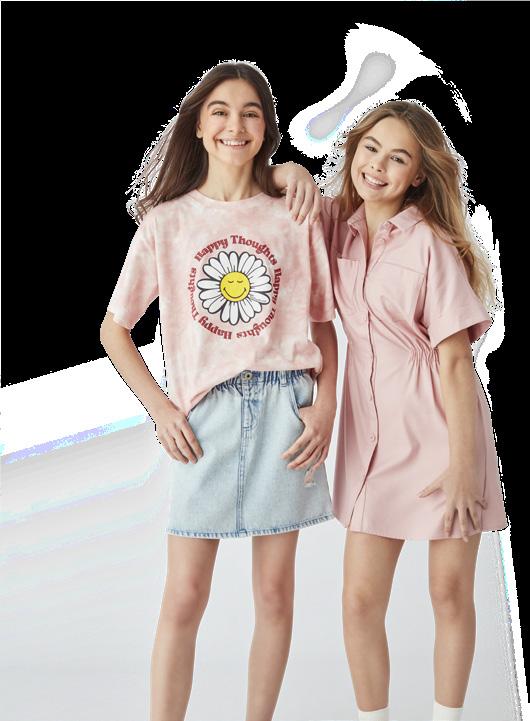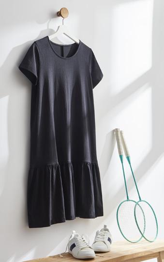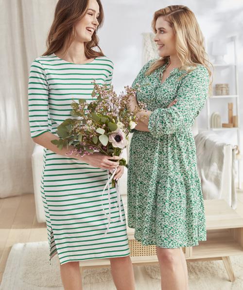 nabrana v pasu, na voljo: 100 % viskoza, z elastikami na vratnem izrezu in rokavih, s karirastim vzorcem ali z zgornjim delom, 100 % bombaž, ter krilom, 95 % bombaž in 5 % elastan, z izrezom v obliki srca, velikosti: 134–170 cm