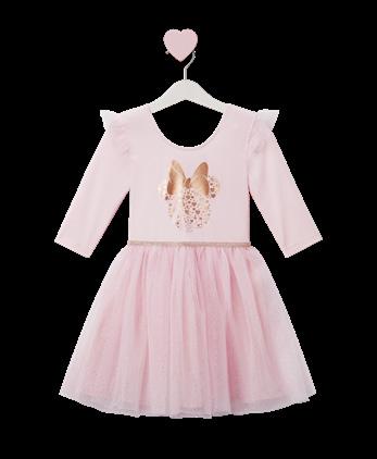 95 % bombaž in 5 % elastan, z naborki iz tila na ramenih, z zlatim potiskom Mini Miške, spodaj dvoplastno krilo iz tila, velikosti: 104–134 cm