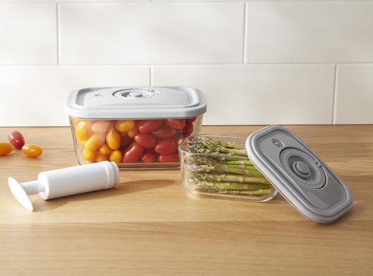 podaljša svežino hrane, steklena, s pokrovom z ventilom, z indikatorjem datuma, v kompletu s tlačilko, možna uporaba v pečici in mikrovalovni pečici brez pokrova, primerna za pranje v pomivalnem stroju, velikost: 14,2 x 10 x 7,2 cm, 19,7 x 14 x 9,8 cm