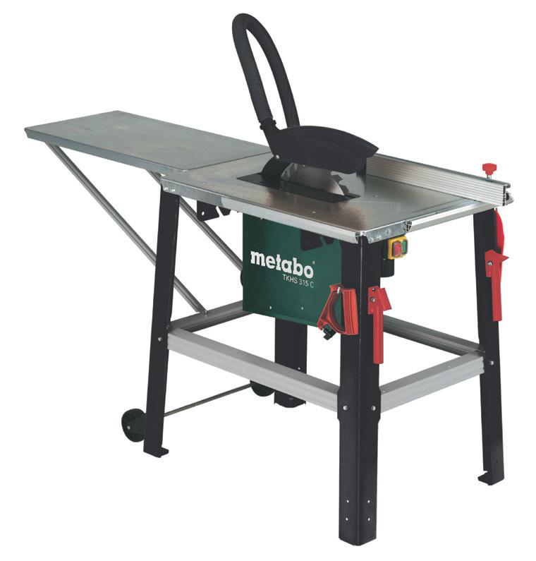 Obračanje mize z natančno nastavitvijo kotov, raztegljiva podaljška mize na obeh straneh, z blokado skrajne lege, vgrajeno omejevalo globine reza, mere podnožja: 760/475/340 mm.