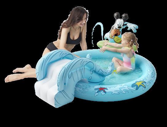 napihljiv, z vodno fontano (zahteva priklop vrtne cevi) na voljo motivi: Miki Miška ali Stitch, velikost: 154 × 125 × 60 cm, za otroke, starejše od 3 let