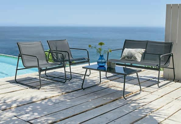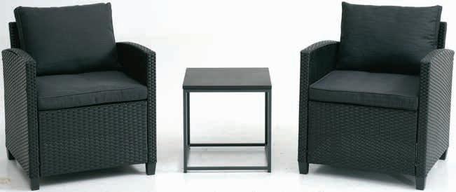 Mizica: Jeklo. Ø50xV40 cm. Stol: Aluminij in poliester zaščiten pred UV-žarki. Z luksuznimi blazinami s trpežno, strukturno tkano prevleko. Š70xV79xG84 cm Mizica 54,99 37,50 Stol 269.- 185.-