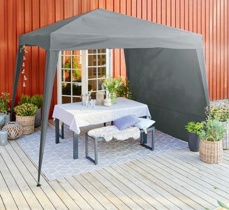 MIZA JERSORE + STOL MELLBY Miza: Aluminij in umetni les. Š70xD70xV74 cm. Stol: Aluminij in tekstilen. S 7 nastavitvami. Zložljiv. Miza 110.- Stol 50.-