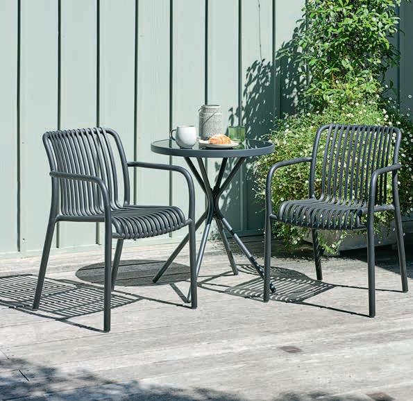 MIZA RADSTRUP + STOL NABBEN Miza: Jeklo in kaljeno steklo. Ø60xV70 cm. Stol: Plastika, zaščitena pred UV-žarki. Nakladljiv. Miza 35.- Stol 50.-