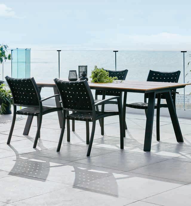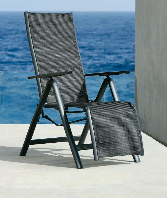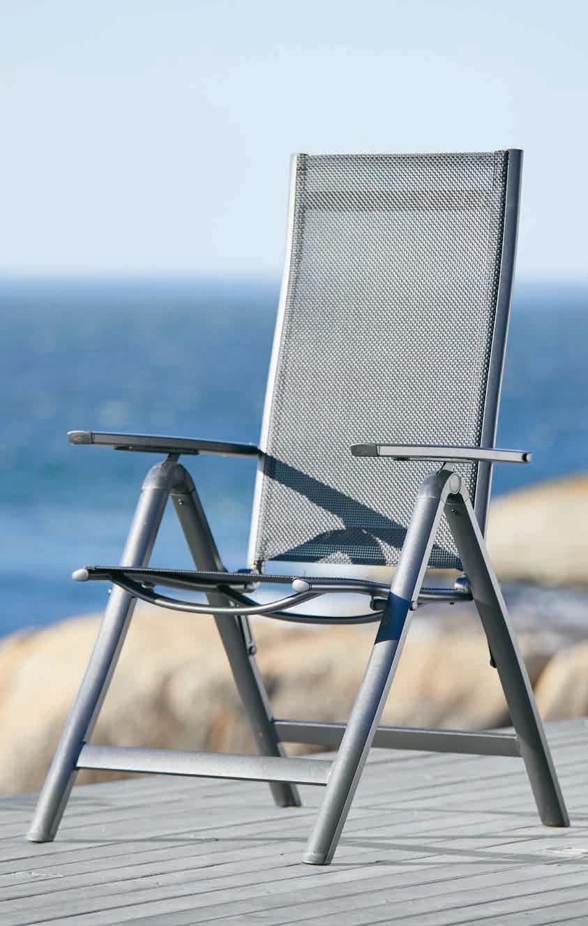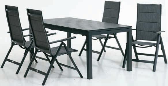 Miza: Aluminij in umetni les. Z 2 dodatnima kriloma, ki ju lahko shranite pod mizo. Š95xD170/273xV76 cm. Stol: Aluminij in tekstilen. S polnilom iz pene, ki se hitro suši. S 6 nastavitvami. Zložljiv. Miza 649.- 475.- Stol 119.- 90.-