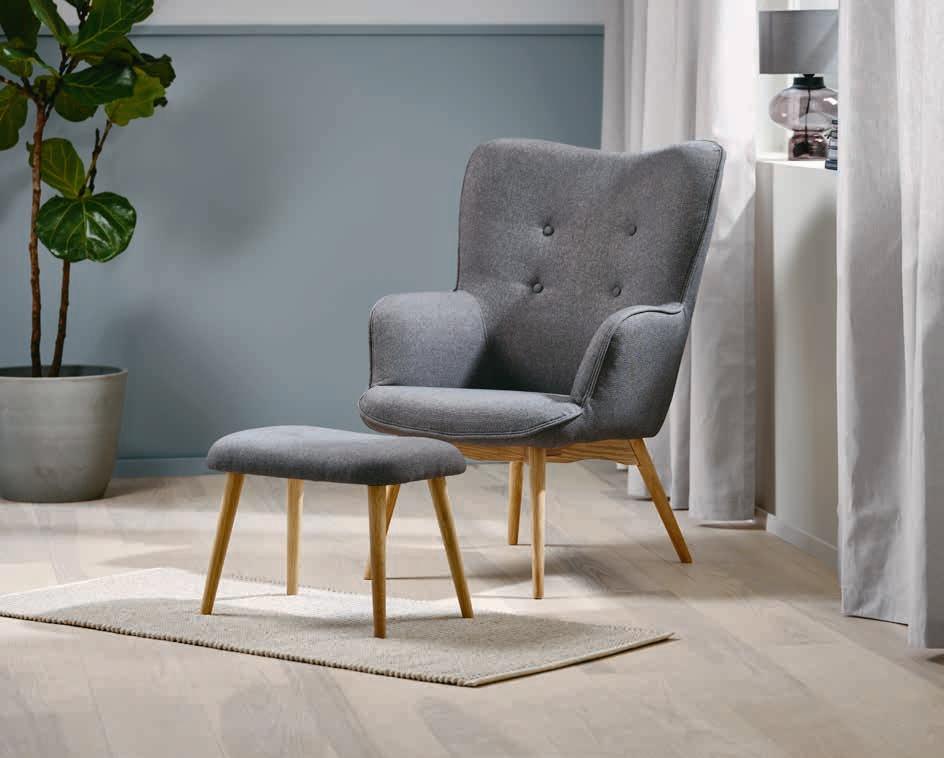 Tkanina. Sedež in naslon iz pene. Noge iz masivnega hrasta. S taburejem. Š72xV94xG117 cm* 399.-