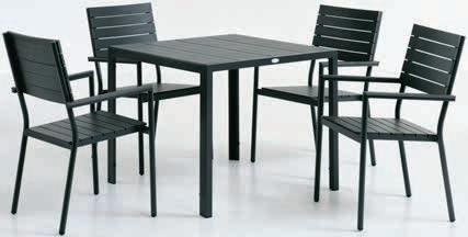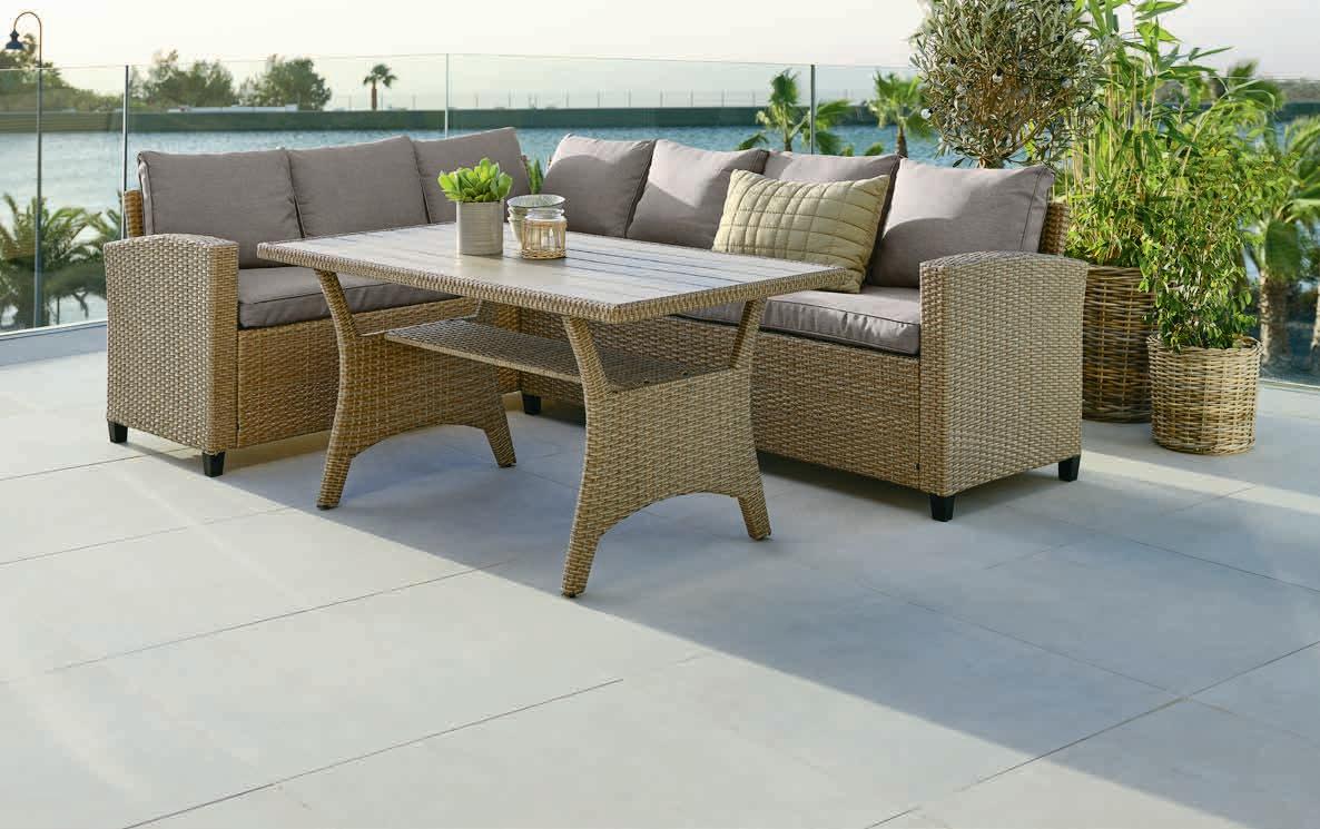 Miza: Jeklo, umetni les in umetni ratan. Š74xD144xV67 cm. Garnitura za 6 oseb: Jeklo in umetni ratan. Podaljšek se ne more uporabljati na obeh straneh. Z luksuznimi blazinami s trpežno, stukturno tkano prevleko. 899.-