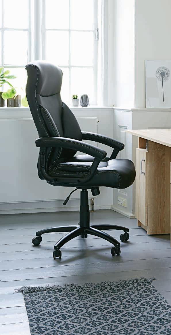 usnje. Sedež iz spominske pene, ki sprošča pritisk. Ogrodje iz jekla. Z nastavljivo višino in brezstopenjskim nagibnim mehanizmom.