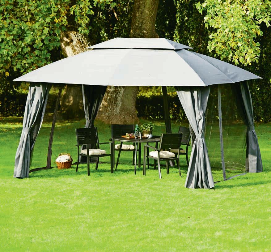 Jekleno ogrodje s platnom iz vodoodbojnega*** poliestra. Vodni stolpec 600 mm. Teža 55 kg. Z odstranljivimi stranicami in mrežo proti mrčesu. Š3xD4xV2,65 m 759.-