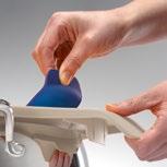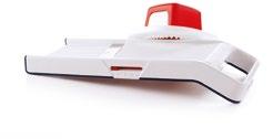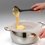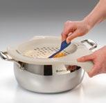 Pripomoček ustrezno namestite na rob posode. Dajte nekoliko pripravljene mase za vlivance na sredino pripomočka (na odprtine). Veliko in udobno držalo omogoča, da pripomoček dobro držite med strganjem mase.