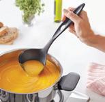 Set ergonomskih kuhinjskih pripomočkov Zasnovan je kot komplet s poudarkom na priročnosti in prilagodljivosti, vsak pripomoček je popolno oblikovan za preprosto mešanje, odcejanje, zajemanje in serviranje iz ponev ali posod. Njihov vzdržljiv, robusten in toplotno odporen material zagotavlja, da bodo zdržali zelo dolgo.
