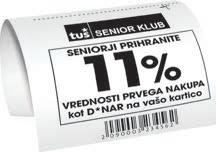 SREDA -11 % D*NAR NA TUŠ KLUB KARTICO: Za ugodnost, pri kateri člani Tuš Senior kluba pridobijo 11 % vrednosti prvega dnevnega nakupa kot D*NAR na Tuš klub kartico, veljajo enaki pogoji kot pri kuponu 10 - 99 %, vendar brez omejitve višine nakupa. Ugodnost se članom Tuš Senior kluba obračuna samodejno, brez predložitve kupona. Senior izdelek je na izbran dan na voljo do razprodaje zalog. Ob nakupu se kuponi in ostale ugodnosti ne obračunajo. Več na www.tus.si.