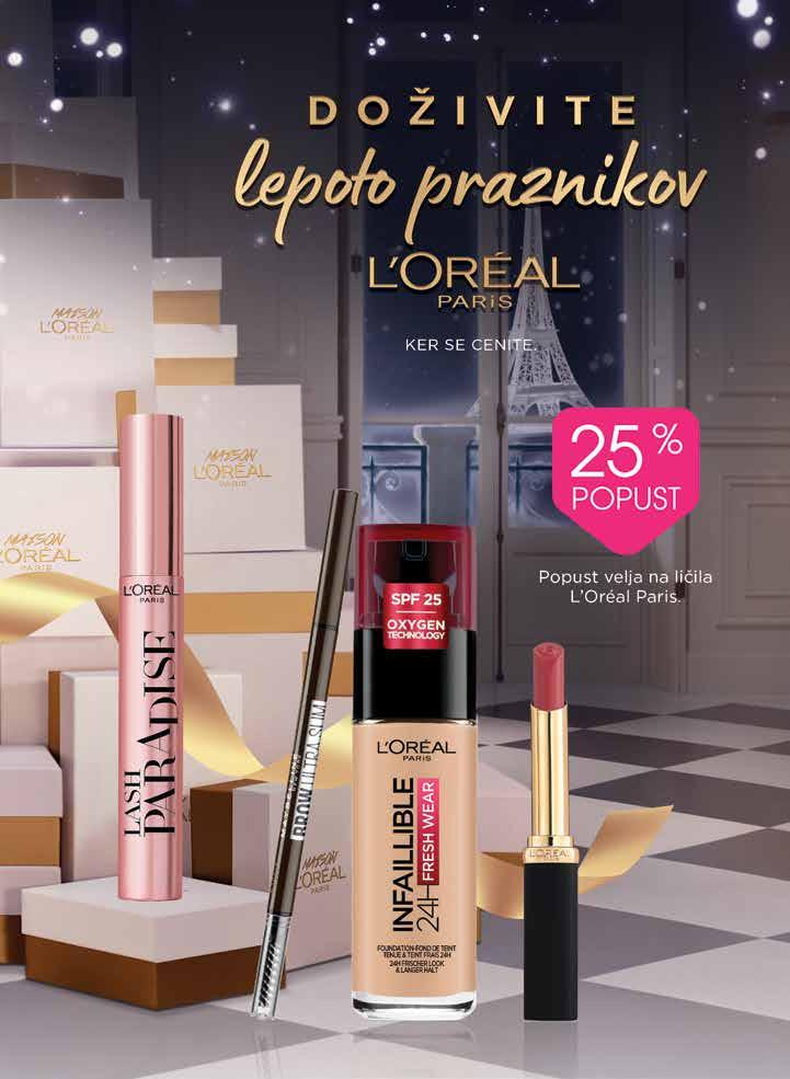 Kiss Impress Color Umetni nohti • več vrst 4 49 8,99 50 % Kiss Blooming Lash Umetne trepalnice KBH • več vrst 599 8,04 POPUST 25 % Popust velja za toaletne torbice Ruj. POPUST 30 % Popust velja za toaletne kovčke Ruj. POPUST 30 % Popust velja za čopiče in gobico za ličenje Real Techniques. POPUST 35 % Popust velja za krtače Tangle Teezer. POPUST 35 % 25 % POPUST Popust velja za izdelke iz linij Revitalift in Hyaluron Specialist L’Oréal Paris. TVOJA NAJLJUBŠA DARILA DOSTAVIMOna dom!