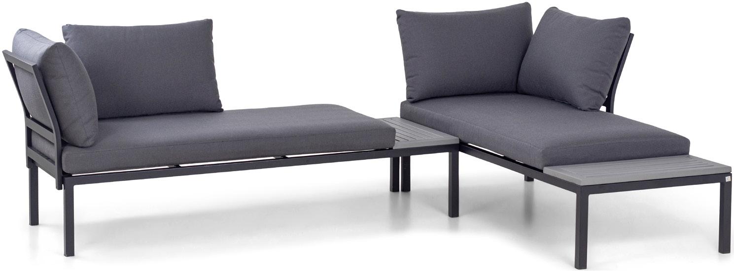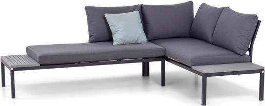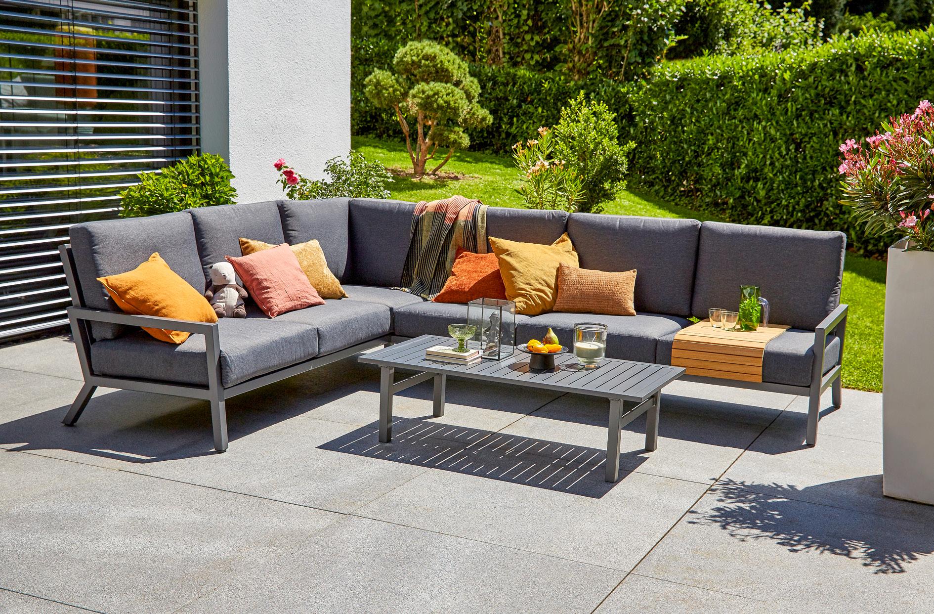sestavljena iz kotne garniture d 191 x š 191 x v 65 cm, večje mizice d 72 x š 72 x v 32 cm in manjše mizice d 62 x š 62 x v 25 cm, ogrodje iz aluminija / FSC certificiran les evkaliptusa, vključno z blazinami iz olefina, antracit / evkaliptus 27078255