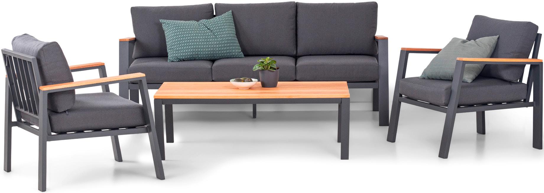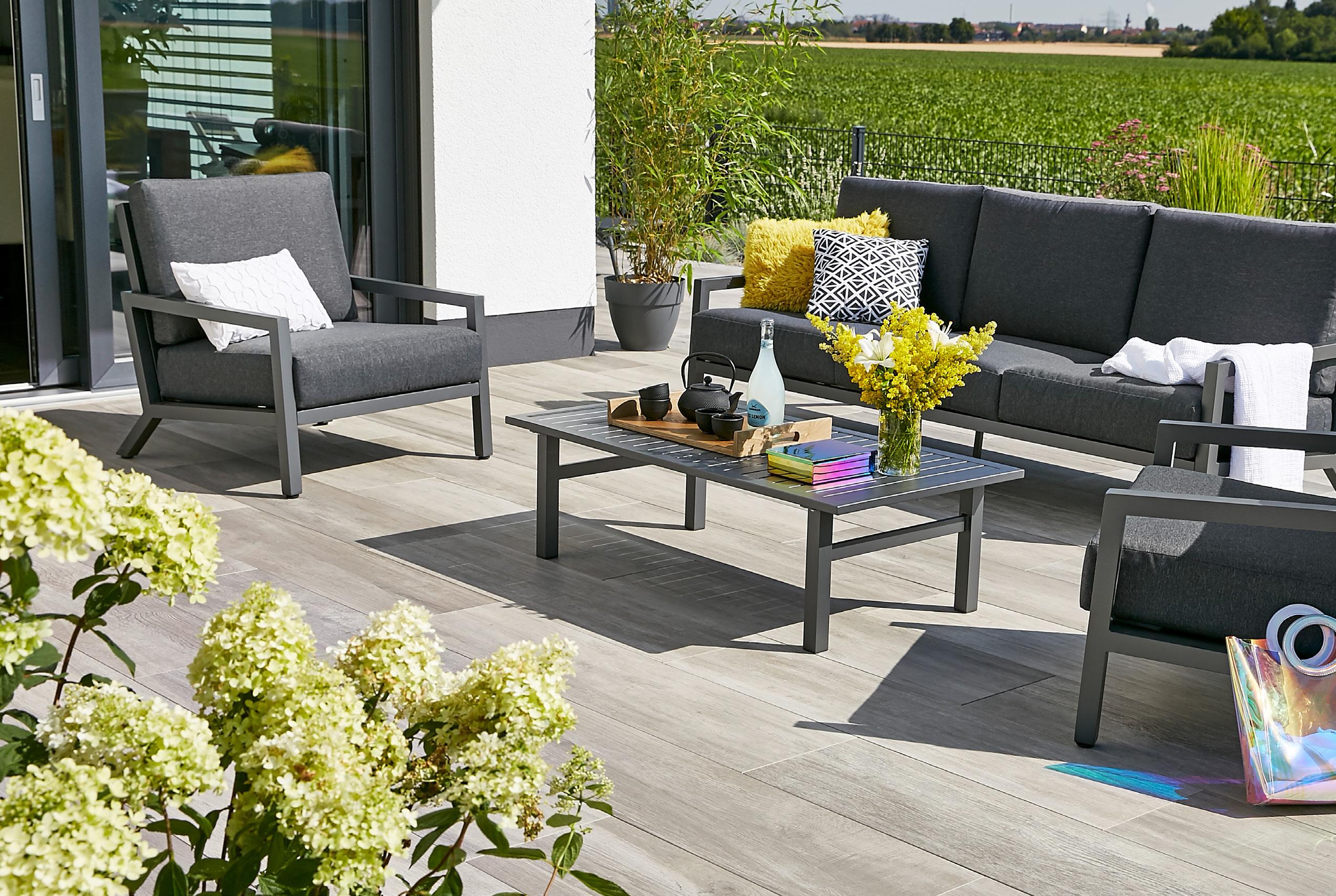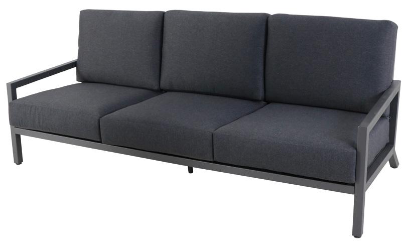 Lounge vrtna garnitura 'Maja' sestavljena iz troseda d 212 x š 85 x v 76 cm, dveh foteljev d 76 x š 85 x v 76 cm in mize d 122 x š 60 x v 36 cm, aluminijasto ogrodje, vklj. blazine, antracit