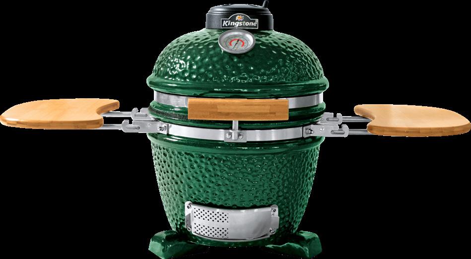 ohišje iz visokokakovostne keramike z glazuro, 2 zložljivi stranski odlagalni polici iz bambusa, s prezračevalnikom, lovilni sistem za pepel, s koleščki, termometrom, primeren za direktno in indirektno pečenje, dušenje ali kuhanje